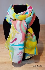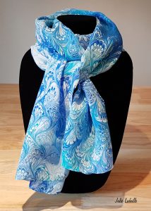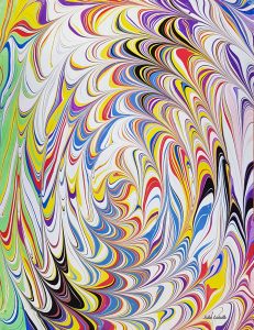 Ma démarche est simple: Après avoir préparé mon eau magique et préparé mes surfaces (soie et papier), je joue littéralement avec les couleurs dans le bassin d’eau. Comme je ne sais jamais comment cela va finir, j’ajoute les couleurs qui m’inspirent les unes après les autres. Je me centre sur moi-même et je laisse l’intuition me guider pour le choix des instruments que je vais utiliser. Pendant l’exécution, il se passe souvent des moments riches en créativité. D’un simple coup de stylet naît des motifs incroyables qu’il serait impossible de faire avec un pinceau. Les couleurs flottent à la surface de l’eau sans se mélanger. À l’aide des instruments, je bouge délicatement les couleurs pour créer des motifs fabuleux selon l’inspiration du moment. Une fois le motif terminé, vient le moment de transférer cette oeuvre sur un papier préparé à recevoir la peinture ou un magnifique foulard de soie.