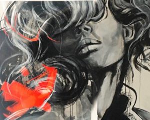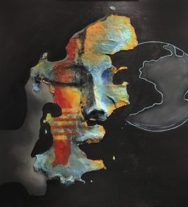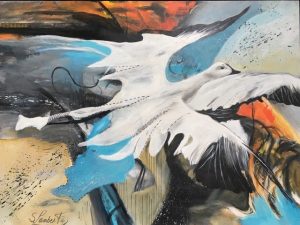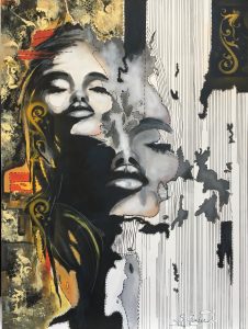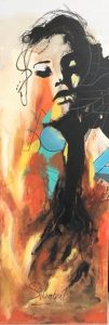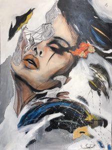 La voici, après toutes ces années. Plus jeune dans un cours de Cégep, on lui avait dit qu’elle avait un talent hors du commun pour inventer et créer. Mais son choix était fait : dans le milieu hospitalier. Faut croire que c’était son destin à ce moment-là. Plusieurs années s’écoulent, elle ne cesse de penser qu’elle devrait s’y remettre. Elle se laisse entraîner par le tourbillon du travail, se lance tantôt en décoration pour des amies, tantôt fleuriste avec exposition en Estrie, tout en gardant son métier. Mais rien ne la satisfait. Elle recommence à peindre. Autodidacte, elle expérimente des techniques sur Internet et tout ce qu’elle peut trouver, rencontre des artistes professionnels en galerie. On l’invite à exposer et c’est là que sa passion refait surface. Elle développe sa technique propre à elle. Elle aime être unique et maintenant la soif de créer l’habite, quoi de plus beau que de retrouver sa grande passion de l’âme. « Tout ce qui bouge m’intéresse. Je le traduis en formes de couture, couleurs et matières .Créer pour être vivante va de soi. Pour ressentir du plaisir. Exprimer mes émotions, extirper cet insondable et indicible pour le partager avec celui qui, peut-être, gardera une trace (message) de ce que j’aurais abandonné dans une respiration et un geste. Créer c’est aussi chercher, fouiller, découvrir, changer le regard, se libérer des contraintes qu’elles soient techniques ou intellectuelles, saisir un mystère qui entoure l’acte de création. J’ai développé une technique propre à moi. Le point de départ est souvent inspiré d’un élément visuel tiré du réel : une photo, une image, que je saisis, observe, parfois dessine de la façon la plus neutre, je me concentre sur le sujet sans tenir compte du support. Ma main est alors un instrument froid et impersonnel qui se met à tracer. Alors, en dehors de toute volonté, lorsque le dessin est fini, je découvre tout ce que ma main a ressenti, un sentiment, une sensation ou juste ce qui m’entoure dans l’atmosphère comme si mon geste était déconnecté de mon esprit, l’invisible du moment, ensuite j’introduis la composition et la couleur qui se précisent au fur et à mesure. J’arrête lorsque mon instinct m’interpelle, j’intègre des espaces blancs par la suite, comme un miroir. Donc le reflet de la société. J’ajoute mes semblants points de couture, alors que tout tourne autour de cette forme de couture, refaire ses patrons de vie, comme je les appelle, de créer sa propre personnalité, sortir du cadre de référence, revoir ses valeurs et priorité au niveau de cette planète qui est la nôtre, l’art se faufile alors je faufile l’art. Bienvenue dans mon monde de couture. »