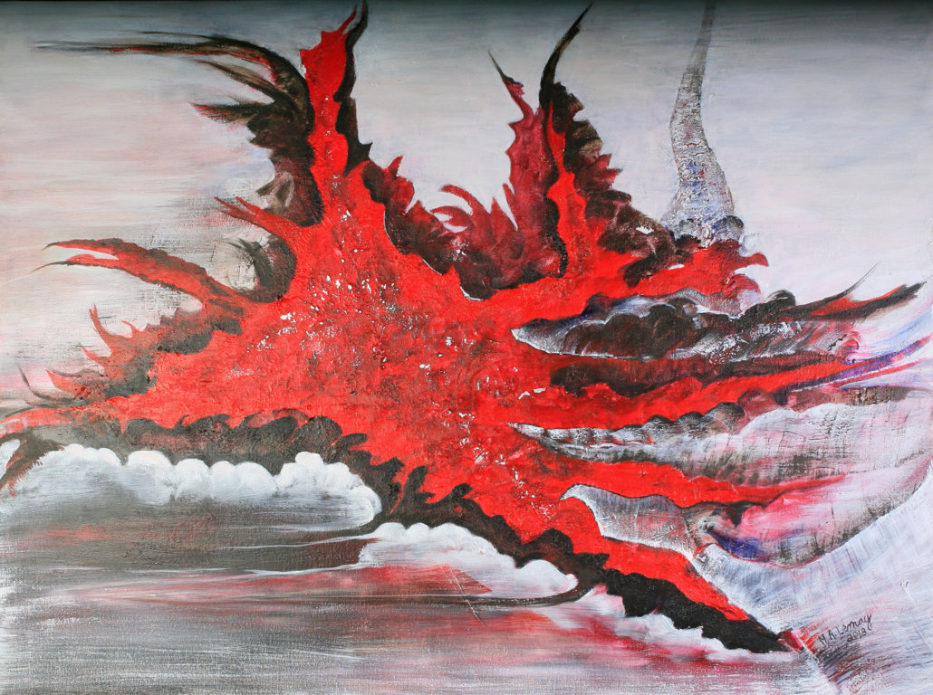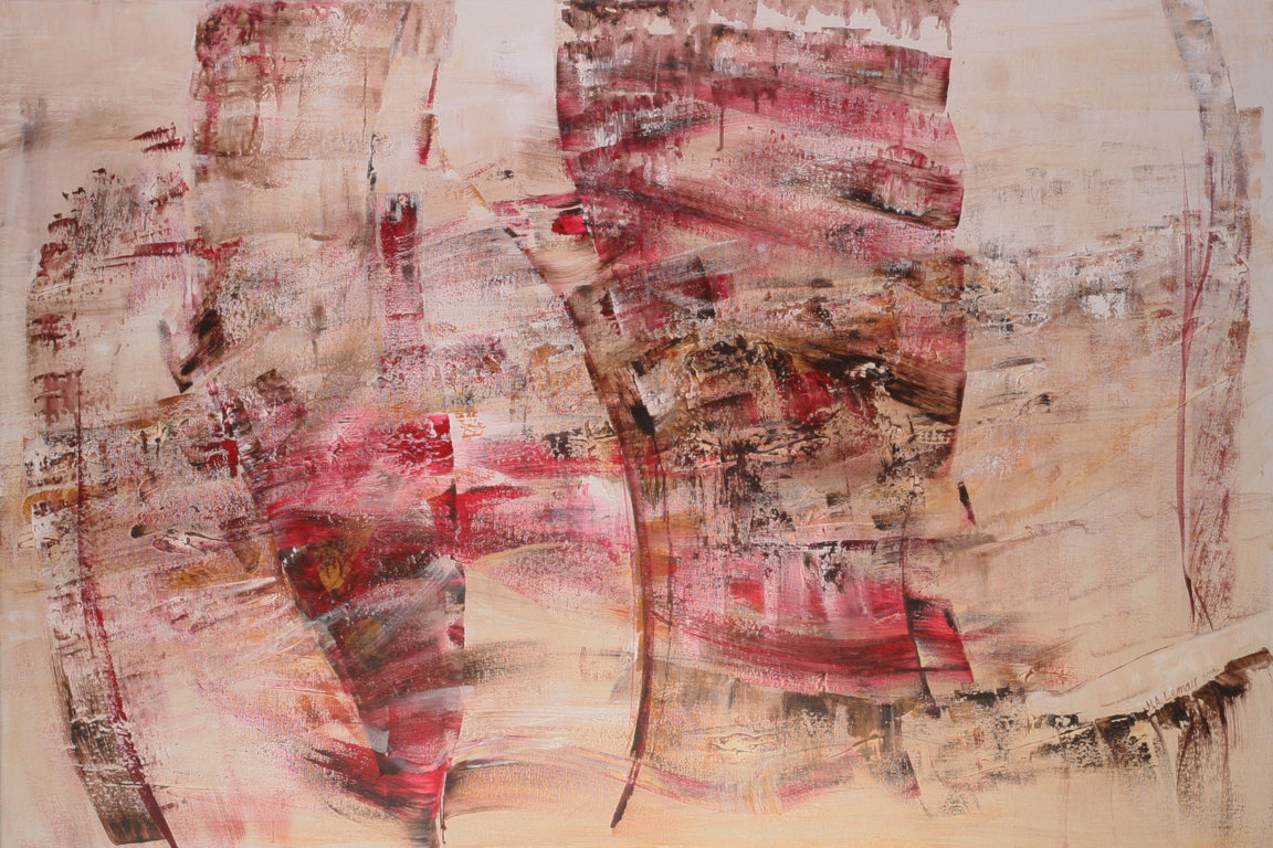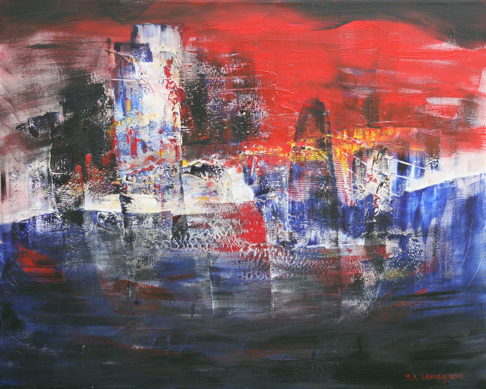 J’ai choisi de l’aborder d’une manière complètement libre, préférant me laisser surprendre et absorber par l’application, de façon aléatoire, de taches de couleurs et de ce qui émerge de la toile. Petit à petit la structure du tableau se précise. Tout en restant en alerte, je poursuis mon travail jusqu’à sa phase finale.